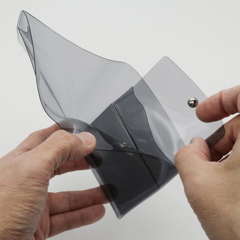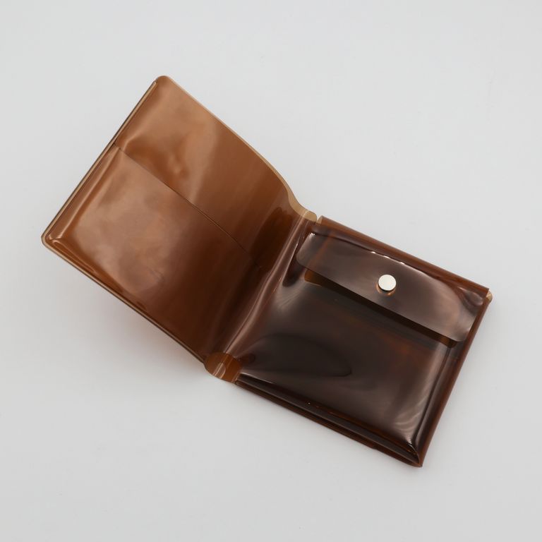 100度を超える温度変化でも容易に変質しない扱いやすいPVCをステッチを使わず溶着で仕上げた折財布。