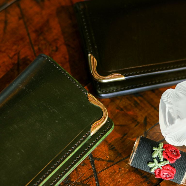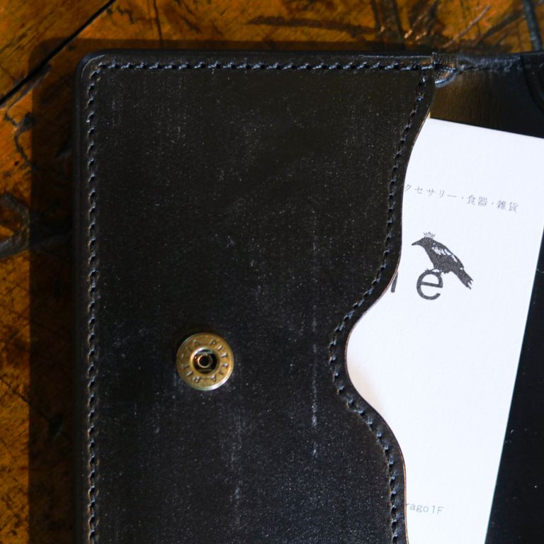 残りわずか 再入荷 池之端銀革店 【Cramp】カードケース UKブライドルレザー 名刺入れ グリーン ¥14,850 税込 135 ポイント還元 発送目安日:1–2営業日 この商品は 送料無料 でお届けします 注文 サイズ(採寸)情報 質問する お気に入り お電話でもご注文いただけます!お電話の際は 商品番号:15368 をお知らせください。 電話をかける 076-245-0067 縦 横 厚み 重量 72 110 15 50 単位:mm(重量:グラム) 商品説明 UKブライドルレザーを使った名刺入れ。東京台東区池之端に工房兼ショップを構えるレザーファクトリー『池之端銀革店』のメインブランド『Cramp』のUKブライドルレザーを使ったカードケース。スマートにして重厚。他では味わえない一品。重厚感のあるブライドルレザーを使いながらも、薄マチのデザインに仕上げており、スーツの胸ポケットなどにもスマートに収まります。かぶせはホック式で開閉し、内側には2つのポケットを装備。自分用といただいた名刺を分けて収納できます。さらに背面にもポケットがあり、合計3つのポケットで名刺を整理可能です。メインの収納部は、前後の革の間に挟まれた3mm厚のマチによって約20枚、かぶせ裏ポケットに約10枚、背面ポケットにも約10枚、合計で40枚ほどの名刺が収納できます。かぶせには補強と装飾を兼ねた真鍮製の隅金を取り付けています。こちらは鋳造で制作されており、板物では出せない存在感が魅力です。通常、コーナーに使うことが多い隅金をデザインのアクセントに取り入れることで、このアイテムだけのユニークな個性となっています。ベルト屋ならではのこだわりの仕上げ。元々ベルト制作からスタートしている『池之端銀革店』らしく、革のヘリを切りっぱなしにしている部分「コバ」は浅草の熟練の職人が昔ながらの「本磨き」で仕上げています。鉋(カンナ)で面取りし、ペーパーがけをして、水性の磨き剤で丹念に時間を掛けて磨きます。顔料・ラッカーを使わないので経年での割れが生じにくく、革の重なり合う様がとても美しいです。UKブライドルレザーこちらは世界三大レザーの1つイギリス産の「ブライドルレザー」を使用しています。ブライドルレザーは馬の足掛けや鞍などに使われる革で鞣しの行程で何度も蜜蝋を染み込ませて革の繊維まで浸透させており、堅牢で耐水性にも優れています。硬く無骨な風合いは他の革に無い個性になります。個体差がありますが、未使用時には表面に「ブルーム」と呼ばれる白いロウの粉が付着していますが、こちらは使い込むことで自然に取れて、艶に変化していきます。使うほどに染み込んだロウが染み出してくるので、ブラッシングや乾拭き中心のケアのみで長くお使いいただけます。 ギフトラッピングについて 大切な方への贈り物、気持ちを込めてラッピングいたします。大事な贈り物。ギフトボックスやラッピングペーパー、ヴィンテージの切手やマッチラベルを使って可愛くお包みします。当店でお取り扱いしております商品には商品ページで特に説明しているもの以外には専用の箱類は付属しません。 ギフトラッピングご希望のお客様にはお店でご用意できる資材を駆使してお相手の方に喜んでいただけますよう、心を込めてお包みさせていただきます。尚、ラッピングの体裁については当店にお任せください。ご用意は一般的なギフト用ラッピングになり、「のし」などの特別なご要望については対応しておりませんのでご了承ください。※送料が安くなるクリックポスト対応の商品でもラッピングの都合上、高さ30mmを超えてしまい、クリックポスト発送の適応外となる場合がございます。ご了承ください。【ラッピングサービス有料化のお知らせ】これまで無料でご提供していたラッピングサービスですが、誠に勝手ながら有料(220円)とさせていただくことになりました。お客様にはご負担をおかけいたしますが、引き続き心を込めて対応いたしますので、ご理解のほどよろしくお願い申し上げます。 詳細情報 カラー グリーン 素材 イギリス製ブライドルレザー(牛革) ブランド 池之端銀革店 品番 Cr-918-GRN カテゴリ 財布・小物 > カードケース 性別 ユニセックス 返品 返品可能条件はこちら ラッピング 可能 発送目安日 1–2営業日 配送方法 ヤマト運輸(送料について) お支払い方法 本商品でご利用可能な決済方法は下記となります。各お支払い方法についての詳細はショッピングガイドをご覧ください クレジットカード払い セキュリティコードとはクレジットカード裏面のサイン欄上部に記載されている数字の一番右の3桁の数字です。アメリカン・エキスプレス・カード提携のクレジットカードの場合、セキュリティコードはクレジットカード表面に記載されている4桁の数字となります。 あと払い (ペイディ) 事前登録不要、クレジットカード登録不要。 メールアドレスと携帯電話番号だけで、今すぐ購入可能。 お支払いは翌月27日までに、コンビニ払い・銀行振込・口座振替で。 1か月に何度購入して