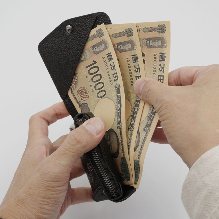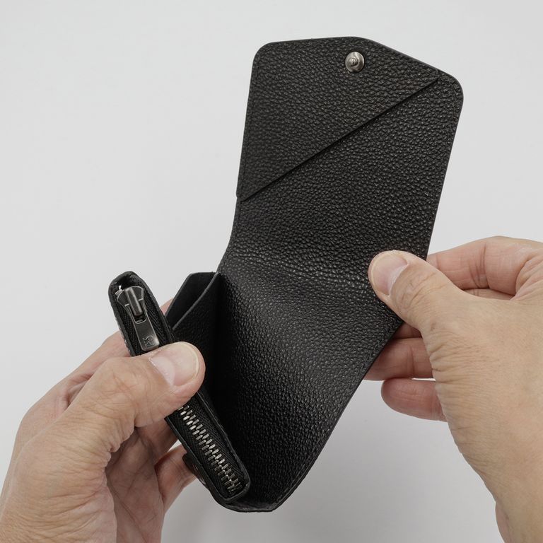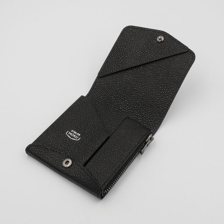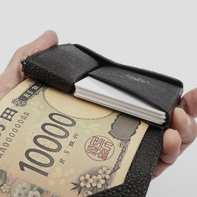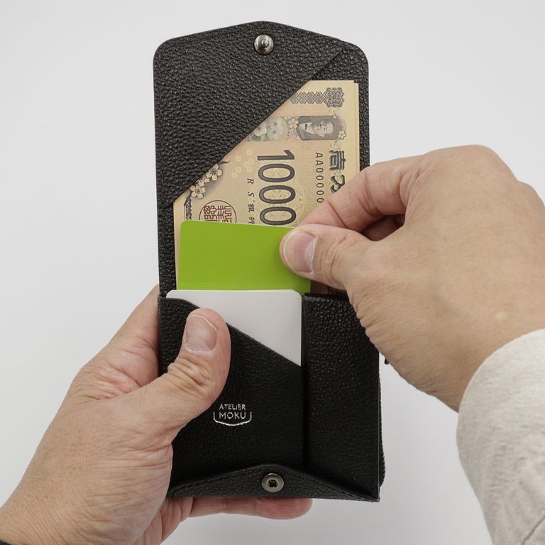 新入荷 ATELIER MOKU 「小さく薄い財布SAKU ver.3 黒桟革」黒 ¥39,600 税込 360 ポイント還元 発送目安日:1–2営業日 この商品は 送料無料 でお届けします 注文 サイズ(採寸)情報 質問する お気に入り お電話でもご注文いただけます!お電話の際は 商品番号:15974 をお知らせください。 電話をかける 076-245-0067 縦 横 奥行 重量 91 93 20 50 単位:mm(重量:グラム) 商品説明 「薄く」「小さく」。すべてがミニマルに完結する、MOKUの象徴。atelier MOKUの手のひらサイズのコンパクト財布「SAKU ver.3」。91×93mmのほぼ正方形のフォルムに、カード・紙幣・硬貨を効率的に収められるよう設計されています。見た目のミニマルさからは想像できない収納力をもち、最大で硬貨18枚、紙幣15枚、厚みのあるプラスチックカード10枚まで収納可能です。それだけ入れても厚さはわずか約22mm。洋服のポケットにもすっきり収まります。上部に配置され直接アクセスできるコインポケットは500円玉がちょうど収まる深さで、両サイドを軽く押すだけで大きく開く構造。視認性が高く、小銭が底に溜まりにくいため、スムーズに出し入れできます。カードポケットは右側に角度をつけ、差し入れや取り出しがしやすい設計。目的のカードがひと目で見つかる使い勝手の良さが魅力です。紙幣はコインポケットとカードポケットの背面に挟み込み、奥側の大きめの札押さえで千円札までしっかりとホールド。外側のホックは表面をフラットに整え、出っ張りを極力抑えた設計。洋服のポケットに入れても引っ掛からず、滑らかに収まります。見た目の美しさと機能性を両立した、「使うほどに完成度を実感できるコンパクトウォレット」です。無双仕立ての「Plus」「Plus」仕様では、内装を裏張り仕立て(無双仕立て)にすることで、手触りの一体感と高級感を向上。それでいて全体の厚みは従来モデルとほぼ変わらず、ポケットや小さめのバッグにも収まりやすい薄さを実現しています。細部のコバ処理や縫製も緻密で、毎日の使用にも型崩れしにくい堅牢な仕上がりになっています。【黒桟革(くろざんがわ)】「黒桟革」は兵庫県姫路市にある「坂本商店」だけが唯一製作することができる「革の黒ダイヤ」の異名を持つ高級皮革。専門の熟練職人でも月に20枚程度しか作ることが出来ない希少な革です。黒毛和牛の銀面に職人が漆を塗っては乾燥させる工程を繰り返し、1枚1枚丁寧に仕上げています。小さなダイヤを散りばめたような輝きが美しく、戦国時代には大将クラスの甲冑に使われていました。摩擦に強く耐久性に優れており、現代では剣道の胴胸などの武道具にも使用されています。 ギフトラッピングについて 大切な方への贈り物、気持ちを込めてラッピングいたします。大事な贈り物。ギフトボックスやラッピングペーパー、ヴィンテージの切手やマッチラベルを使って可愛くお包みします。当店でお取り扱いしております商品には商品ページで特に説明しているもの以外には専用の箱類は付属しません。 ギフトラッピングご希望のお客様にはお店でご用意できる資材を駆使してお相手の方に喜んでいただけますよう、心を込めてお包みさせていただきます。尚、ラッピングの体裁については当店にお任せください。ご用意は一般的なギフト用ラッピングになり、「のし」などの特別なご要望については対応しておりませんのでご了承ください。【ラッピングサービス有料化のお知らせ】これまで無料でご提供していたラッピングサービスですが、誠に勝手ながら有料(220円)とさせていただくことになりました。お客様にはご負担をおかけいたしますが、引き続き心を込めて対応いたしますので、ご理解のほどよろしくお願い申し上げます。 詳細情報 カラー 黒 素材 日本・姫路レザー「黒桟革」 ブランド ATELIER MOKU 品番 SAKU3p-kuro-KR カテゴリ 財布・小物 > 財布 > 折り財布 財布・小物 > 財布 > コンパクト財布 財布・小物 > 財布 > 薄財布 性別 ユニセックス 返品 返品可能条件はこちら ラッピング 可能 発送目安日 1–2営業日 配送方法 ヤマト運輸(送料について) お支払い方法 本商品でご利用可能な決済方法は下記となります。各お支払い方法についての詳細はショッピングガイドをご覧ください クレジットカード払い セキュリティコードとはクレジットカード裏面のサイン欄上部に記載されている数字の一番右の3桁の数字です。アメリカン・エキスプレス・カード提携のクレジットカードの場合、セキュリティコードはクレジットカード表面に記載されている4桁の数字となります。 あと払い (ペイディ) 事前登録不要、クレジットカード登録不要。 メールアドレスと携帯電話番号だけで、今すぐ購入可能。 お支払いは翌月27日までに、コンビニ払い・銀行振込・口座振替で。 1か月に何度購入しても、お支払いは翌月まとめて1回でOK。 さらに、ペイディアプリから本人確認をすると、分割手数料無料*の3回あと払い**、ご利用可能額の確認、使い過ぎを防止する予算設定など