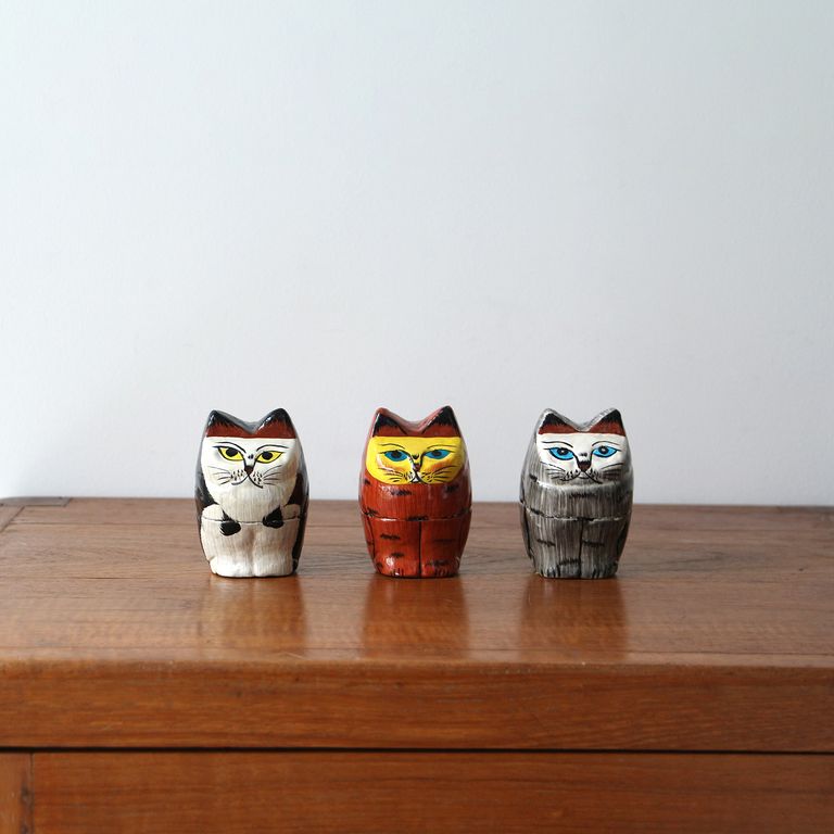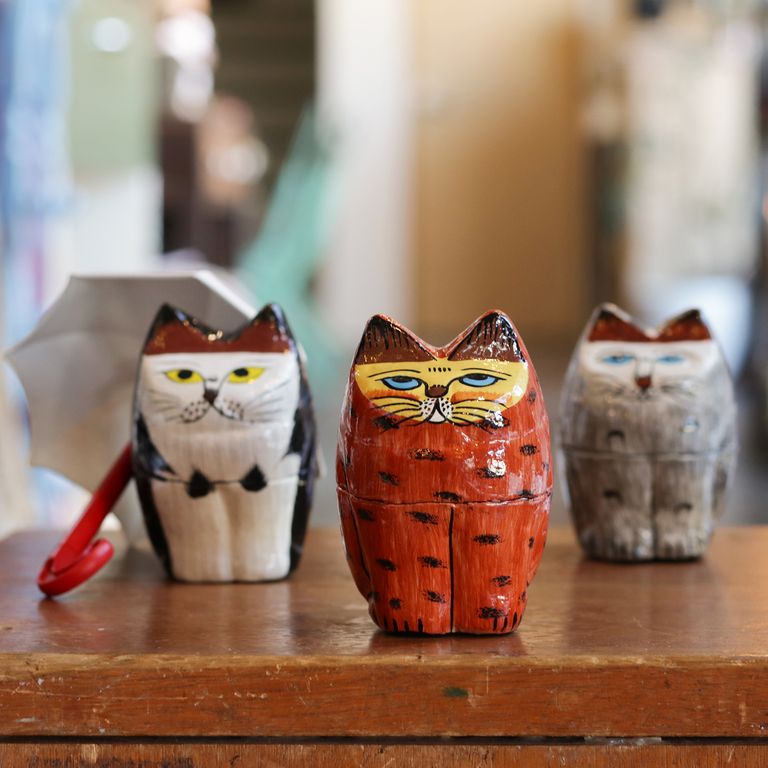 インドの職人が一つひとつ手描きで仕上げた、猫モチーフの「Papier Mache(パピエマシェ)」の小物入れ。