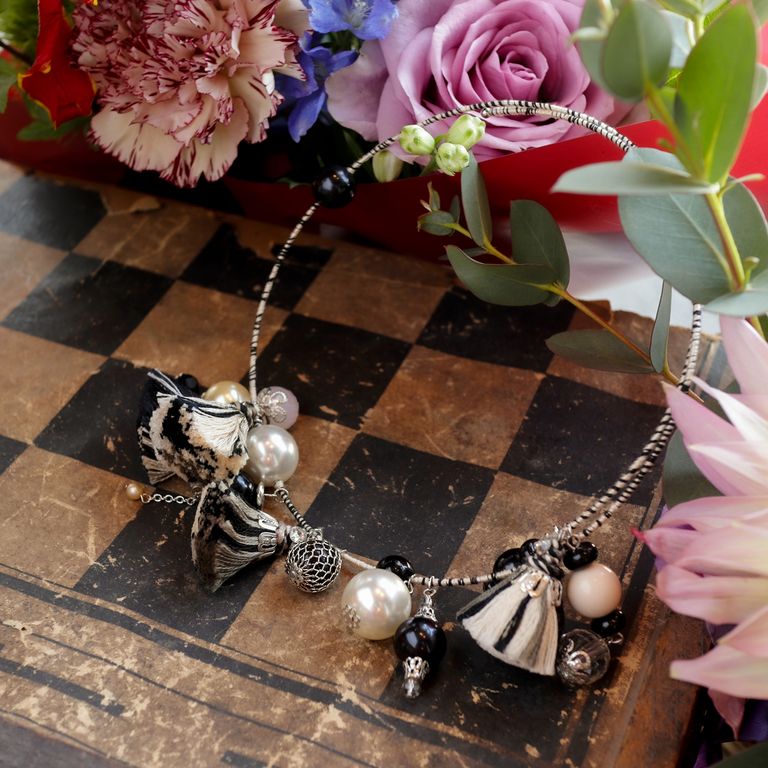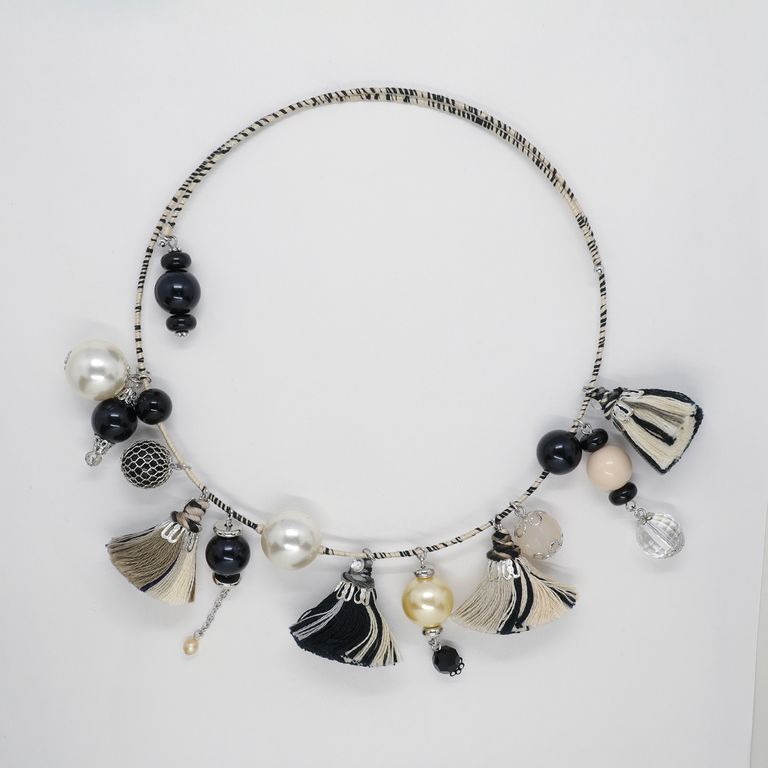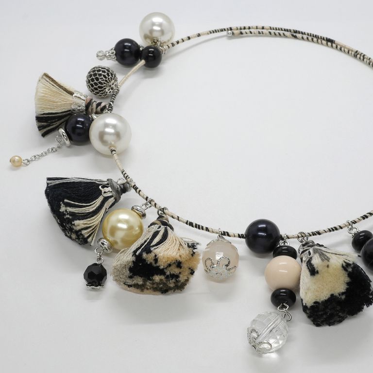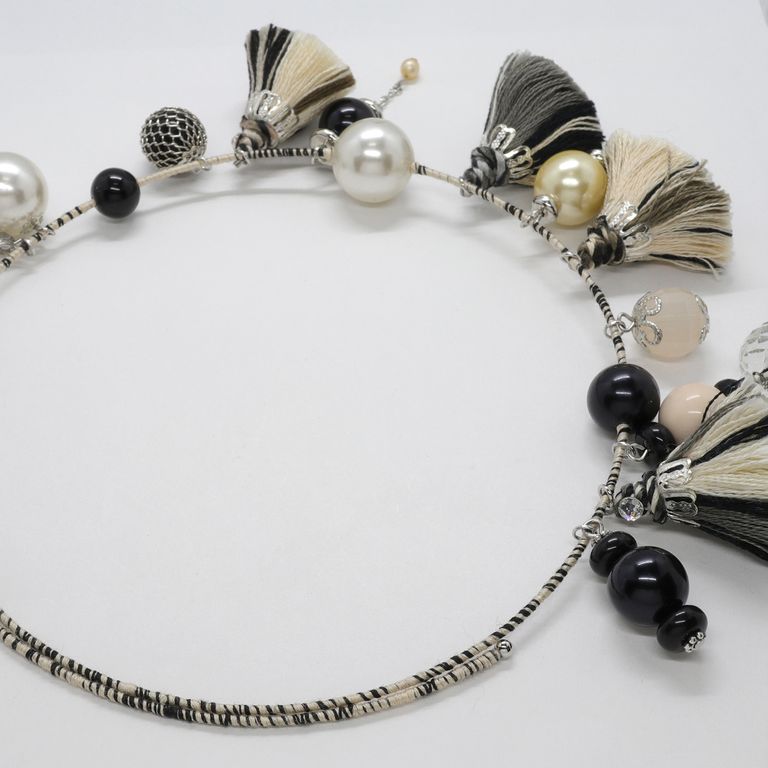コロコロとしたタッセルが4つ並んだ、賑やかなチョーカー。ワイヤーに粒ビーズが連なる様子は、どこか楽器のようなリズムを感じさせるデザインです。
