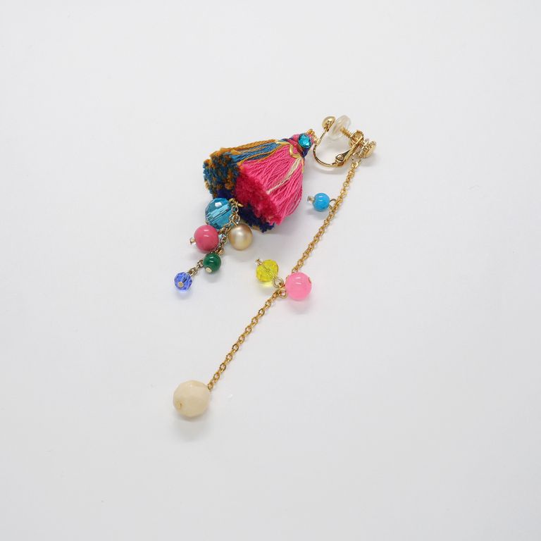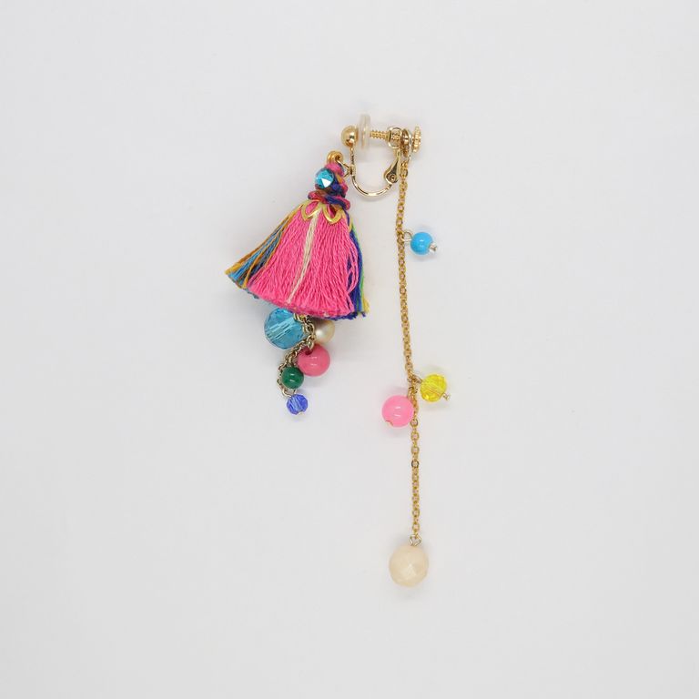 人気のドレスタイプをベースに、軽やかに仕上げたショートバージョン。タッセルの下に重なるビーズの彩りと、さりげなく揺れるチェーンのバランスが印象的なデザインです。