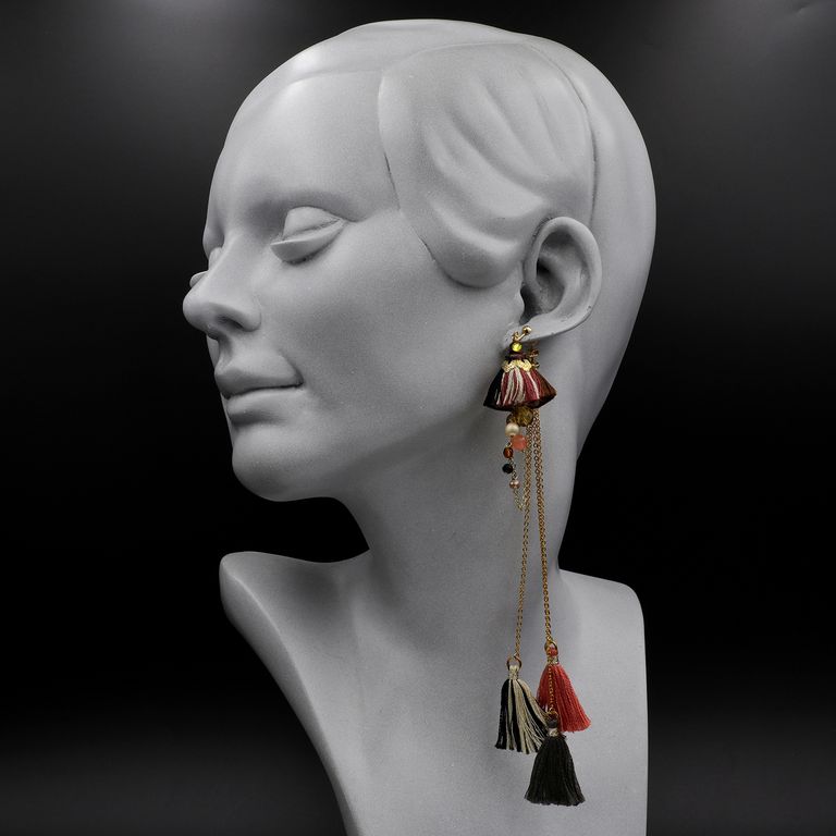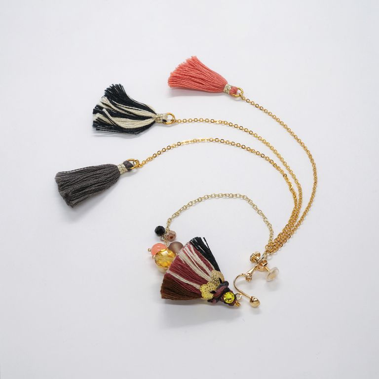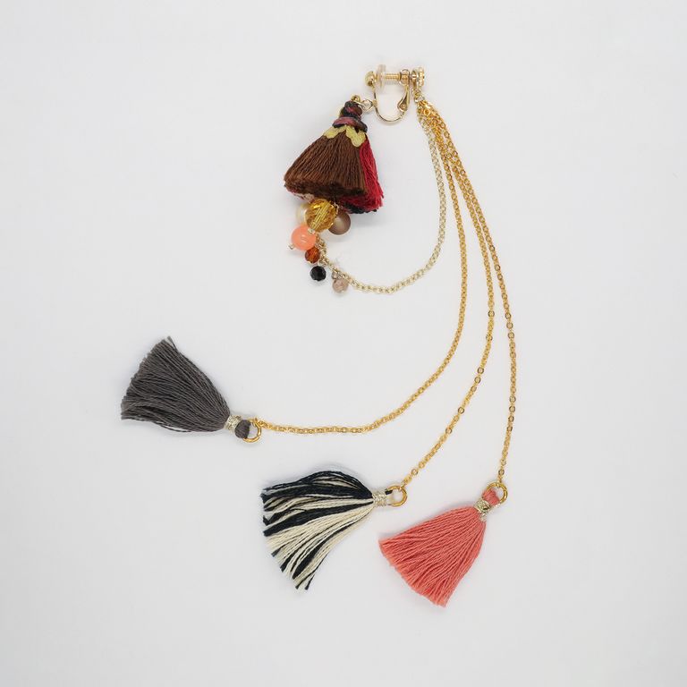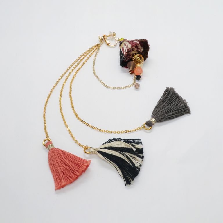 タッセルから後ろへと繋がるチェーン、そして背面に垂れる先には小さなタッセル。ひとつ耳に添えるだけで、まるでドレスを纏ったようなリッチな気分を楽しめるデザインです。