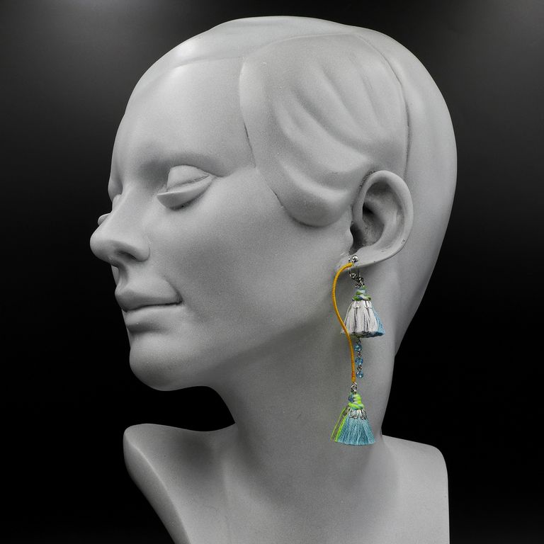 耳の前後にタッセルが来る構造で、動きに合わせてリズムを刻むような表情を生み出します。視線の角度によって見え方が変わり、シンプルな装いにもさりげないアクセントを添えてくれます。