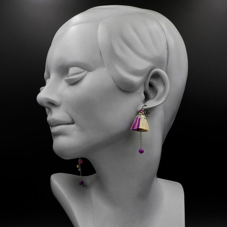 作家自ら染色したコットン糸で仕立てられたタッセルは、ボリューム感たっぷり。ふわっと広がるスカートのようなシルエットで、まるで舞踏会のワンシーンのような佇まいです。