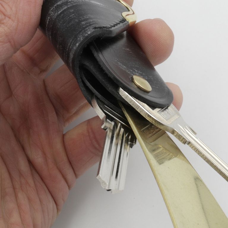 フラップを開けると2層の収納部に分かれており、板鍵を4本取り付け、回転させることで出し入れします。付属のシューホーンを外すと最大6本まで収納できます。